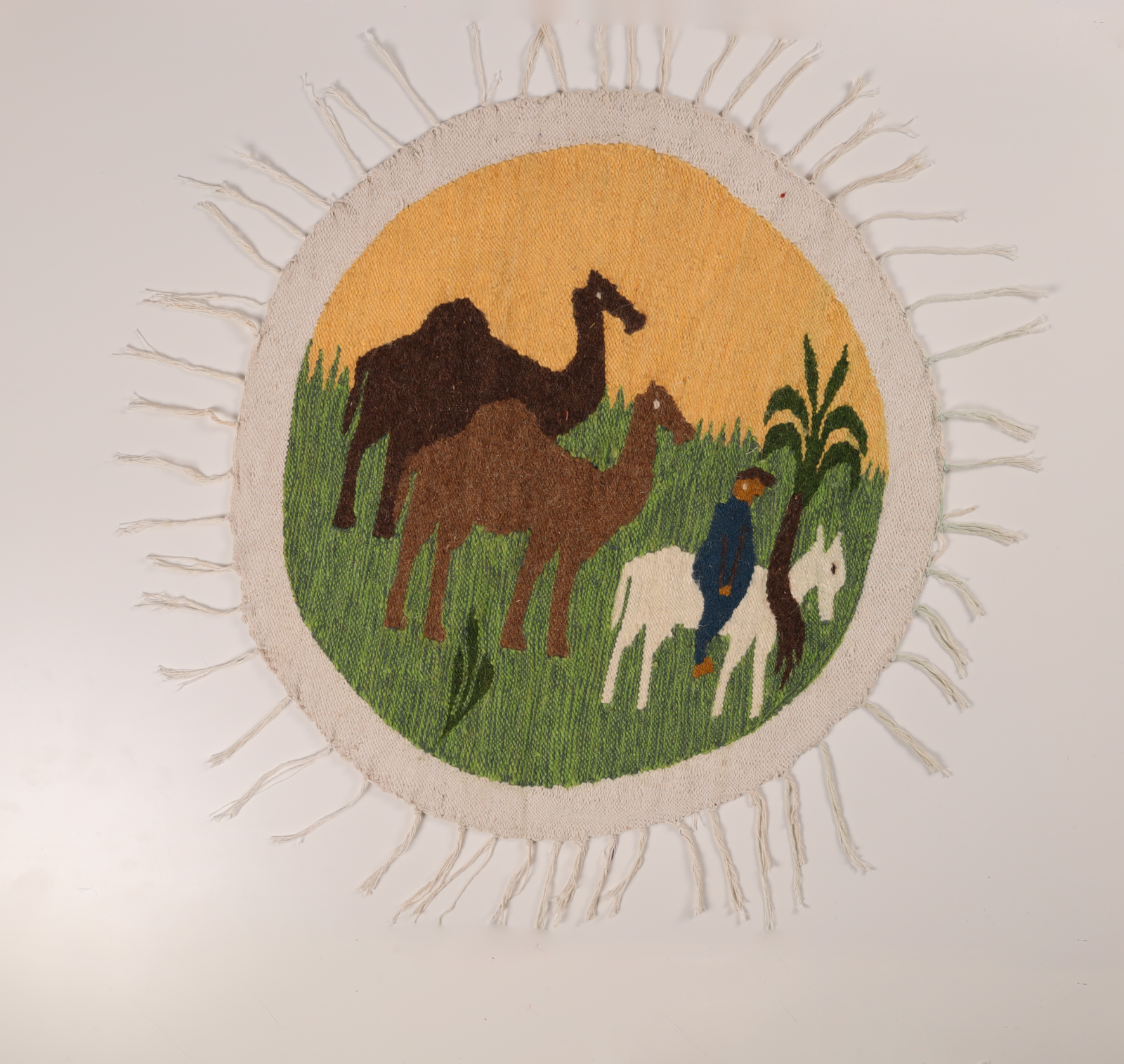 Size: 20 – 30 cm. Small woven study in green with an abstract ochre house and stone path—finished with fringe.