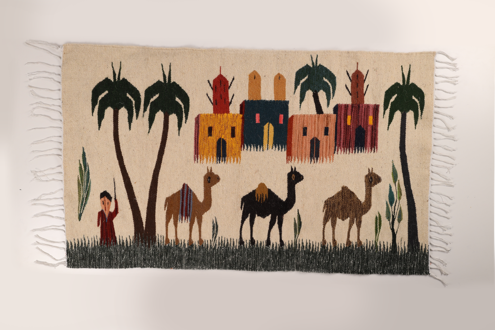 Inspired by the Wadi Mujib gorge pouring into the Dead Sea, this piece layers deep sea-blue with bands of sand and reed-green, echoing cliffs, shoreline, and calm water—classic scenery for Bani Hamida lands south of Madaba.