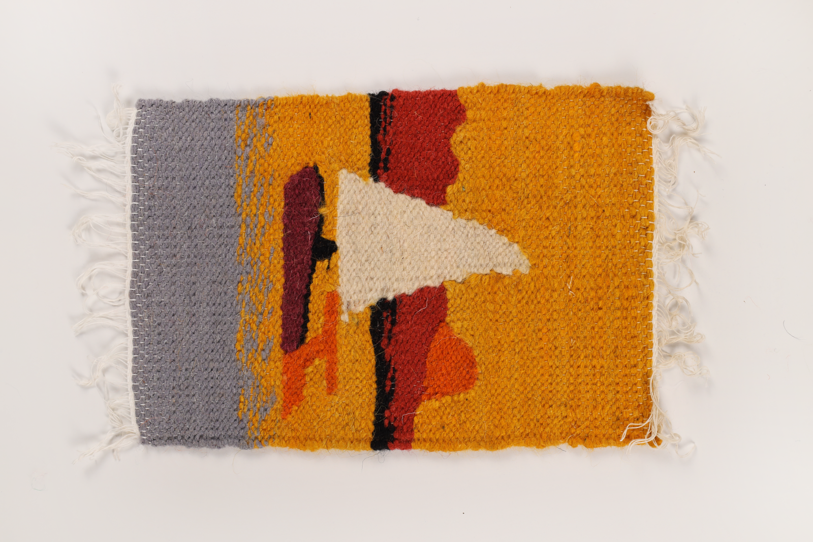 A compact hand‑woven wool panel with a crimson field and bold black silhouette that recalls the dark outline of Machaerus (Mukawir) at dusk. A grey side band and a citron streak suggest stony tracks and scrub on the plateau where Bani Hamida weavers live.