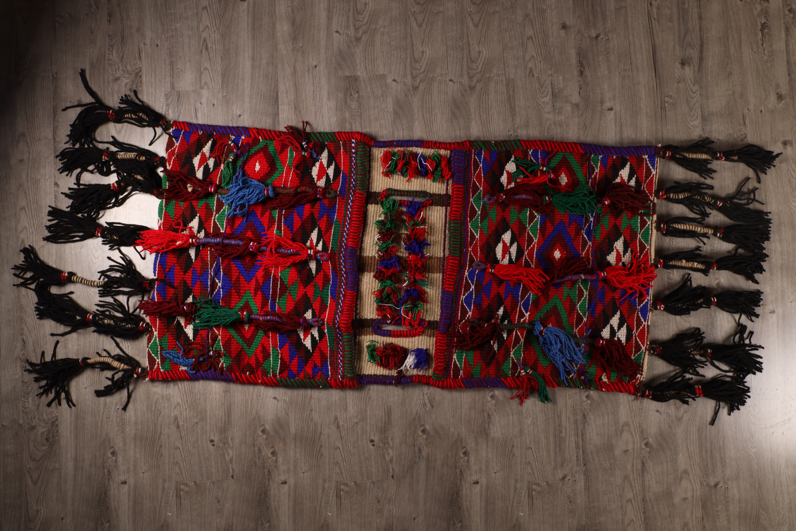 A long runner featuring consecutive star-and-cross medallions in desert golds, reds and greens. The energetic motif evokes the movement of camel caravans pausing at the Qatraneh fortress along the King’s/Desert Highways.